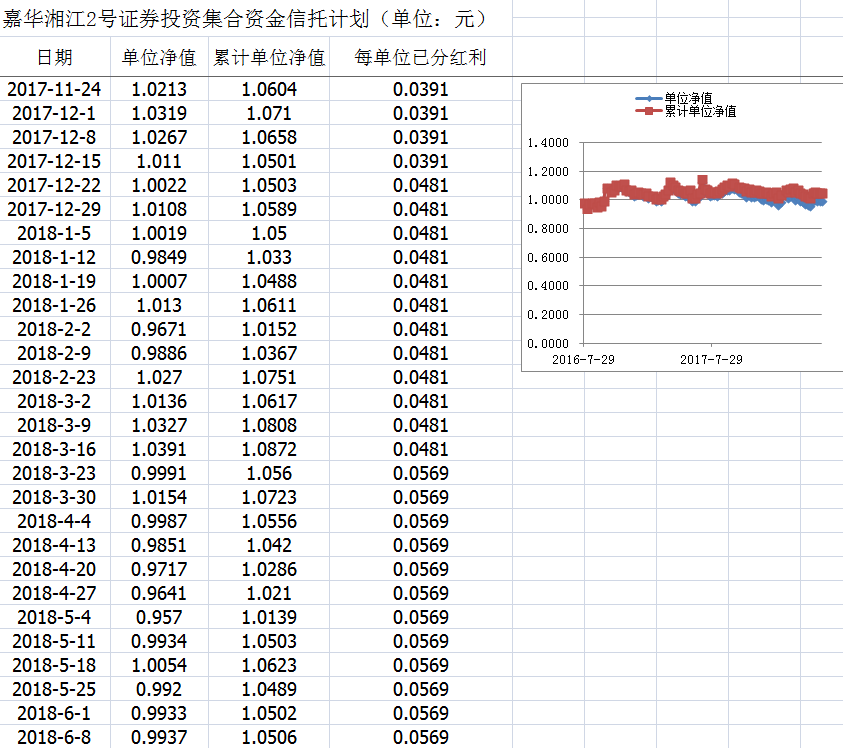 嘉华湘江2号证券投资集合资金信托计划净值披露(2018年6月8日)