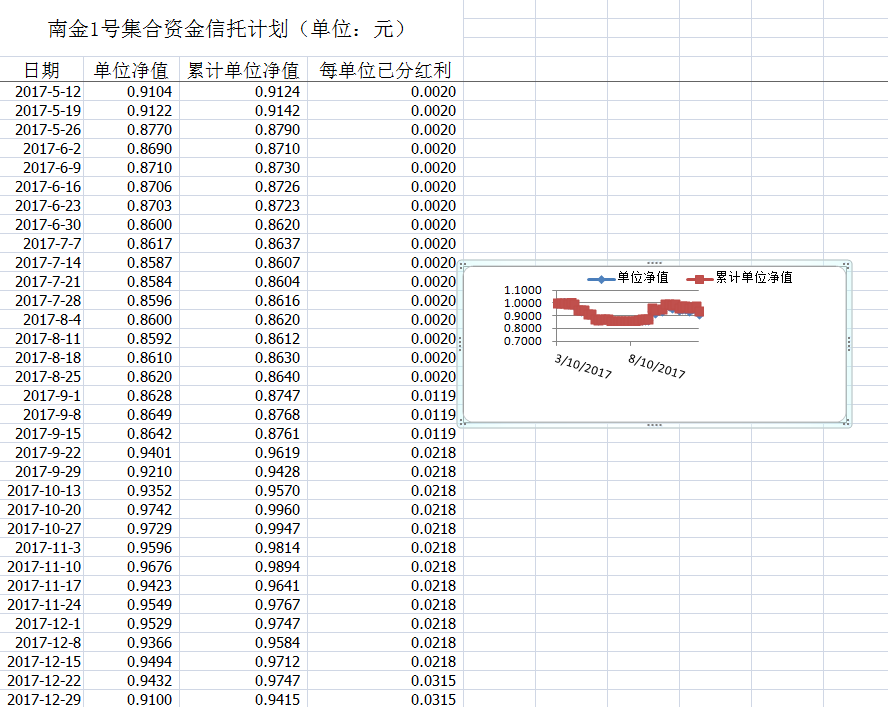 湖南信托-南金1号集合资金信托计划净值披露(2017年12月29日)