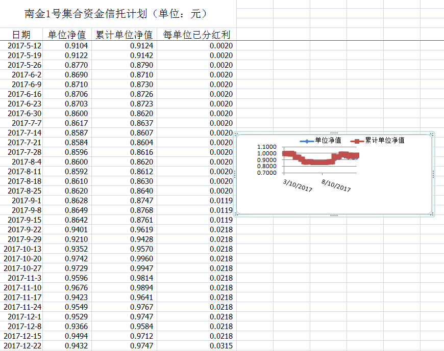湖南信托-南金1号集合资金信托计划净值披露(2017年12月22日)