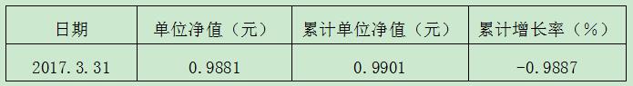 截止2017年3月31日,实现信托财产净值增长为:-0.9887%。