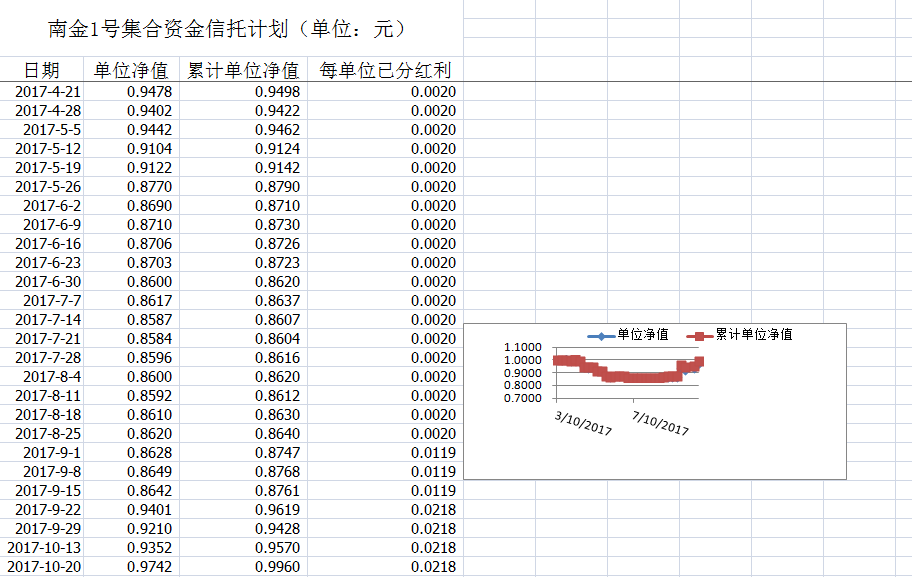 湖南信托-南金1号集合资金信托计划净值披露(2017年10月20日)