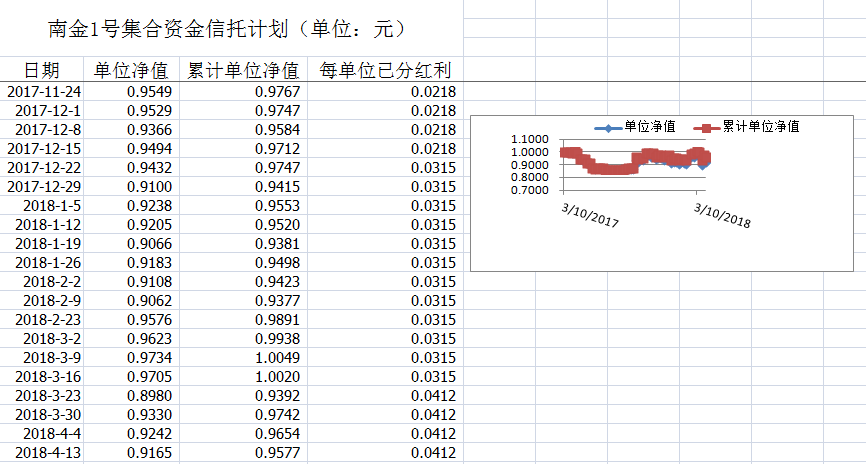 湖南信托-南金1号集合资金信托计划净值披露(2018年4月13日)