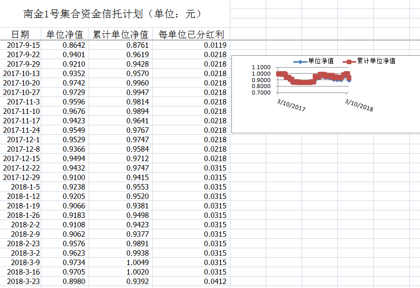 湖南信托-南金1号集合资金信托计划净值披露(2018年3月23日)