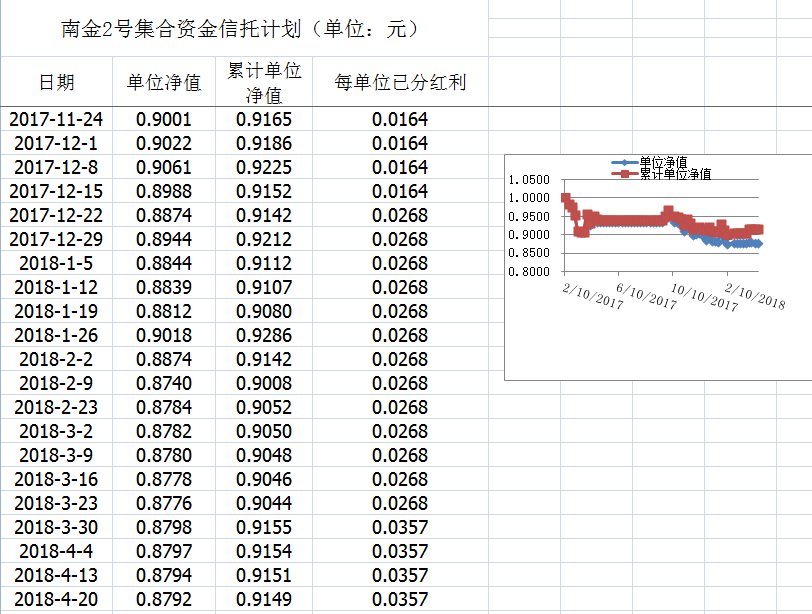 湖南信托-南金2号集合资金信托计划净值披露(2018年4月20日)