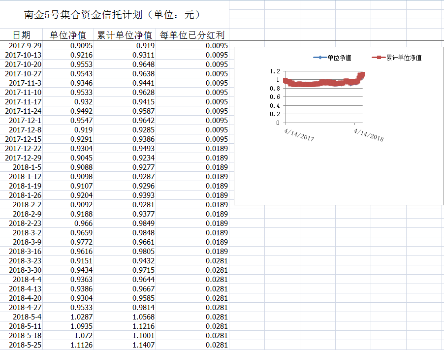 湖南信托-南金5号集合资金信托计划净值披露(2018年5月25日)