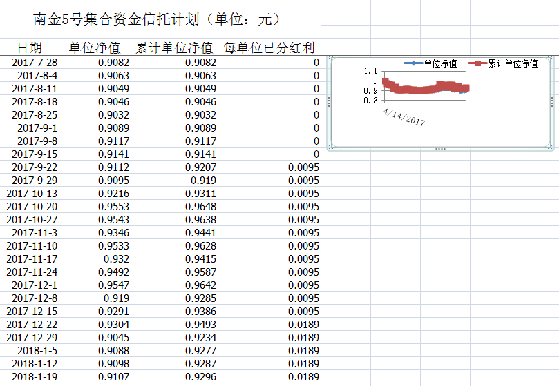 湖南信托-南金5号集合资金信托计划净值披露(2018年1月19日)