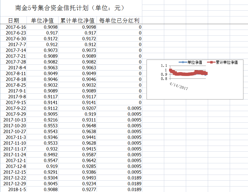 湖南信托-南金5号集合资金信托计划净值披露(2018年1月5日)
