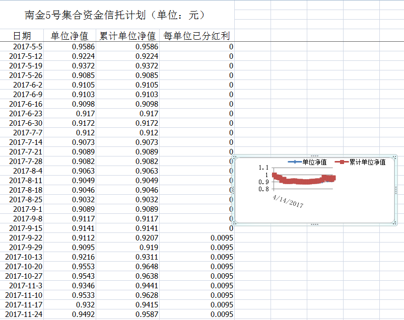 湖南信托-南金5号集合资金信托计划净值披露(2017年11月24日)