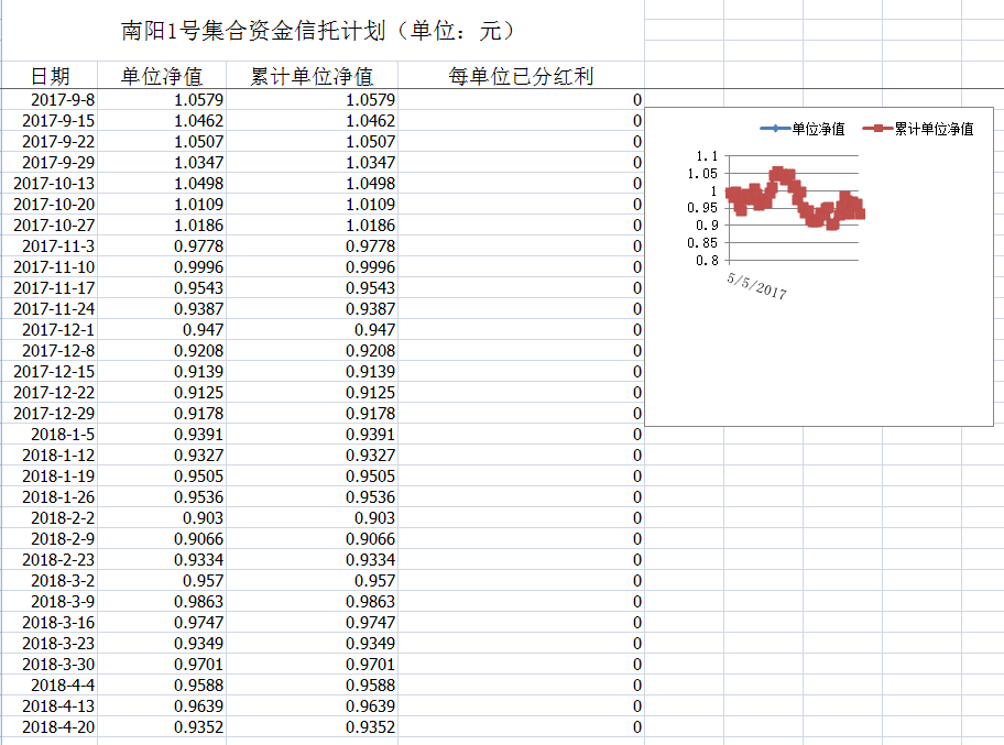 湖南信托-南阳1号集合资金信托计划净值披露(2018年4月20日)