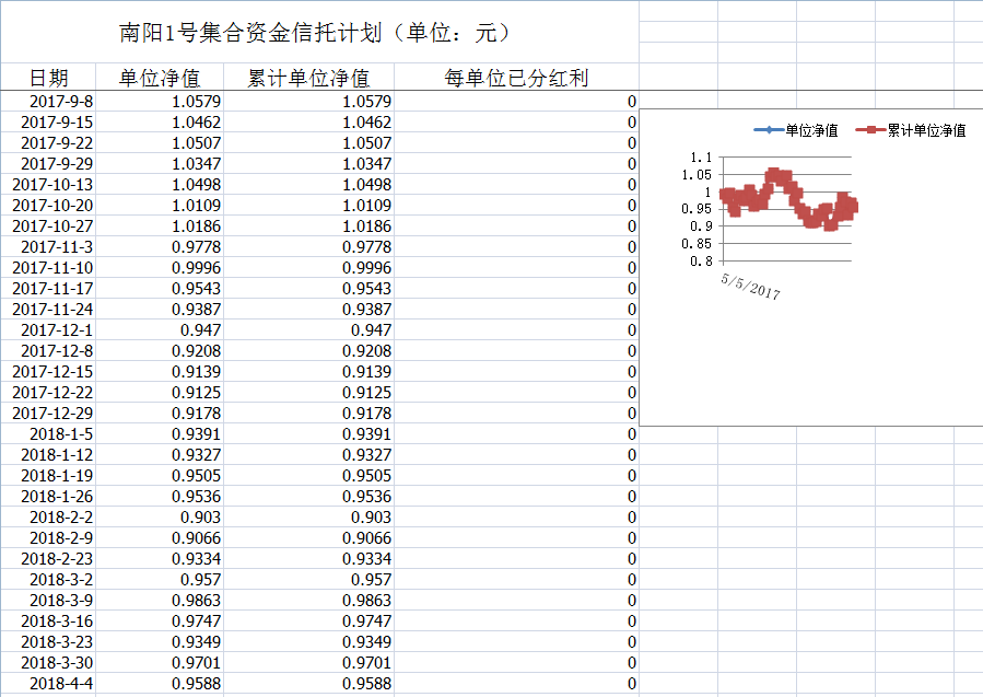 湖南信托-南阳1号集合资金信托计划净值披露(2018年4月4日)