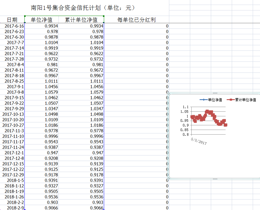 湖南信托-南阳1号集合资金信托计划净值披露(2018年2月9日)