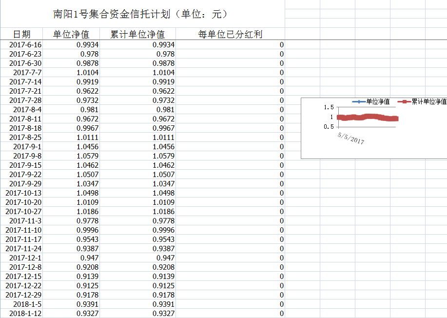 湖南信托-南阳1号集合资金信托计划净值披露(2018年1月12日)